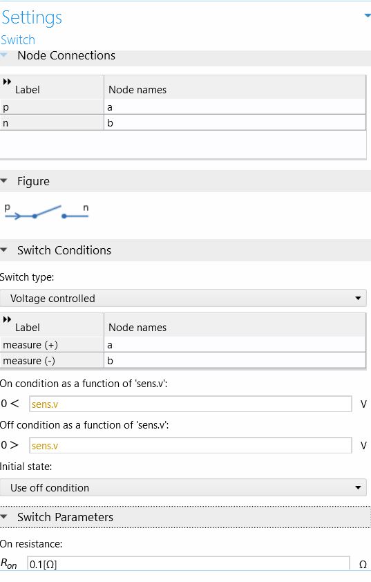 I wonder if one of the comsol reps here would be willing to share how the setup the v.sens function in order to get the switch to work (assuming using the switch as voltage controlled)? What does one put in for the line "On condition as a function of sens.v". Do both On and Off need to be filled in? I would think that if the initial state is selected as either on or off you would only need to fill in one of these but the documentation seems limited.