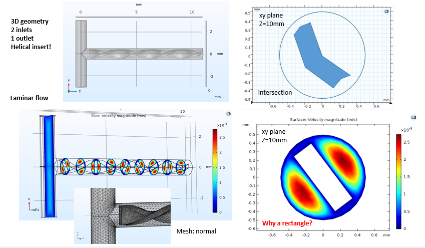 I computed a stationary study and, apparently, the simulation ran correctly. However, in results>velocity>slice plots (xy), I found an inconsistency between the result and the geometry of the helical insert. Why the slice plot shows the helical insert as a perfect rectangle? When doing a xy cut plane at z=10 mm (geometry>work plane>plane geometry) the intersection shows a polygon because of the “curvature” of the helical insert, as expected [see attached image].