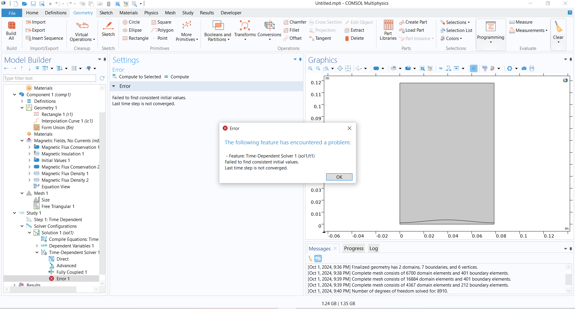 Thank you sir for replying my problem. Sir, I try to simulate film boiling under the influence of magnetic field. My computational domain is 2D Rectangle in which Top most boundary condition is derivative of magnetic scalar potential (Vm) with respect to Y is -H_not and for bottommost boundary condition is derivative of magnetic scalar potential is H_not. I don't know the the initial value of magnetic scalar potential anywhere in domain. As you suggested I apply the magnetic flux density at the boundary when I try to simulate the study,it shows me error as follows: "Failed to fined consistent initial value". It is time dependent simulation as bubble formation ocuurs. I searched past 3 days regarding my problem this but I didn't find any solution. Most of tutorial of permanent magnet is using stationary and using B-H curve. Please help me to solve my problem.I would be very grateful