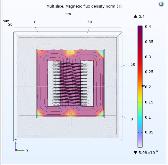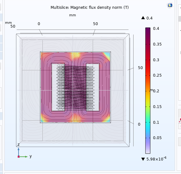 1. Issue with B-H Curve and Flux Density • I have assigned the B-H curve as the material property for the core. • After running a stationary study, the maximum flux density (Bmax) is showing approximately 400 T. • This value is physically unrealistic, since ferrite materials typically saturate around 0.3–0.5 T.
