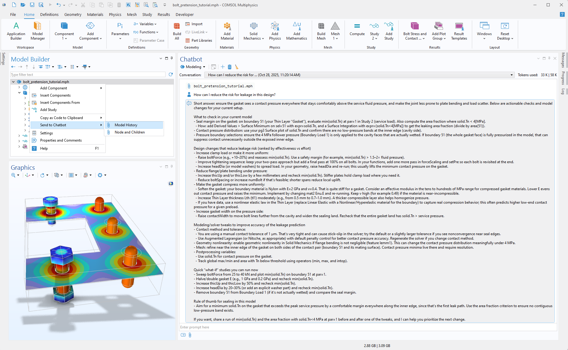 Chatbot WindowThe Chatbot window providing guidance on gasket leakage after the entire model file is attached to the prompt.