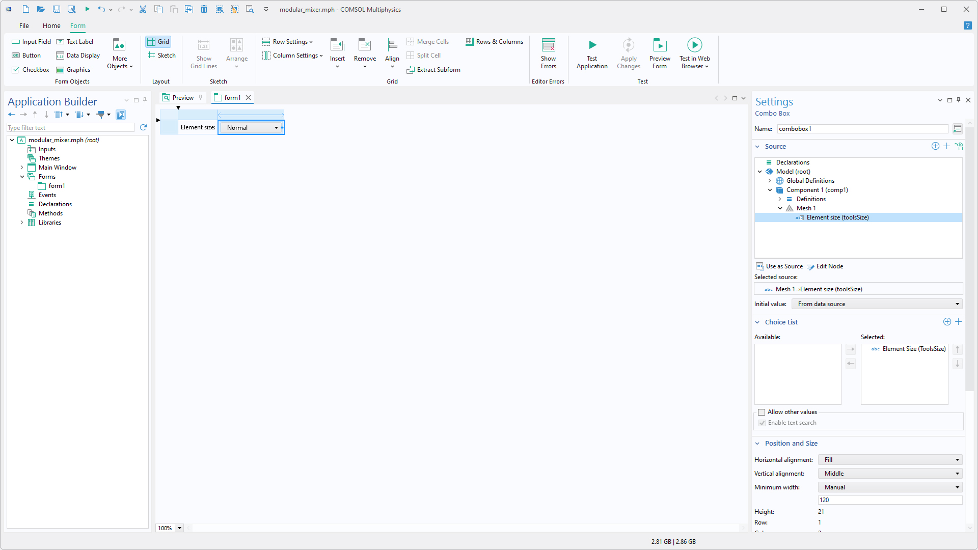 L'accès aux données est désormais disponible pour des noeuds plus hauts dans l'arborescence du Constructeur de modèles, incluant les noeuds Géométrie, Maillage, Etude et Résultats, ce qui permet d'utiliser leurs réglages directement comme sources pour des objets de formulaire dans le Constructeur d'applications, sans avoir besoin d'écrire une méthode avec du code.
