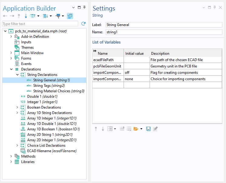 Il est désormais possible d'ajouter plusieurs noeuds de déclaration pour les types suivants: Chaîne de caractères, Booléen, Entier et Réel double précision, ainsi que leurs versions tableau 1D et tableau 2D. Cette fonctionnalité simplifie la structure et l'organisation des applications en regroupant les variables liées, comme il est possible de le faire avec les groupes de paramètres dans le Constructeur de modèles. Chaque groupe peut être doté d'un nom explicite et consulté de façon indépendante via la COMSOL API for use with Java, permettant de gérer les variables d'une façon plus claire et plus efficace.