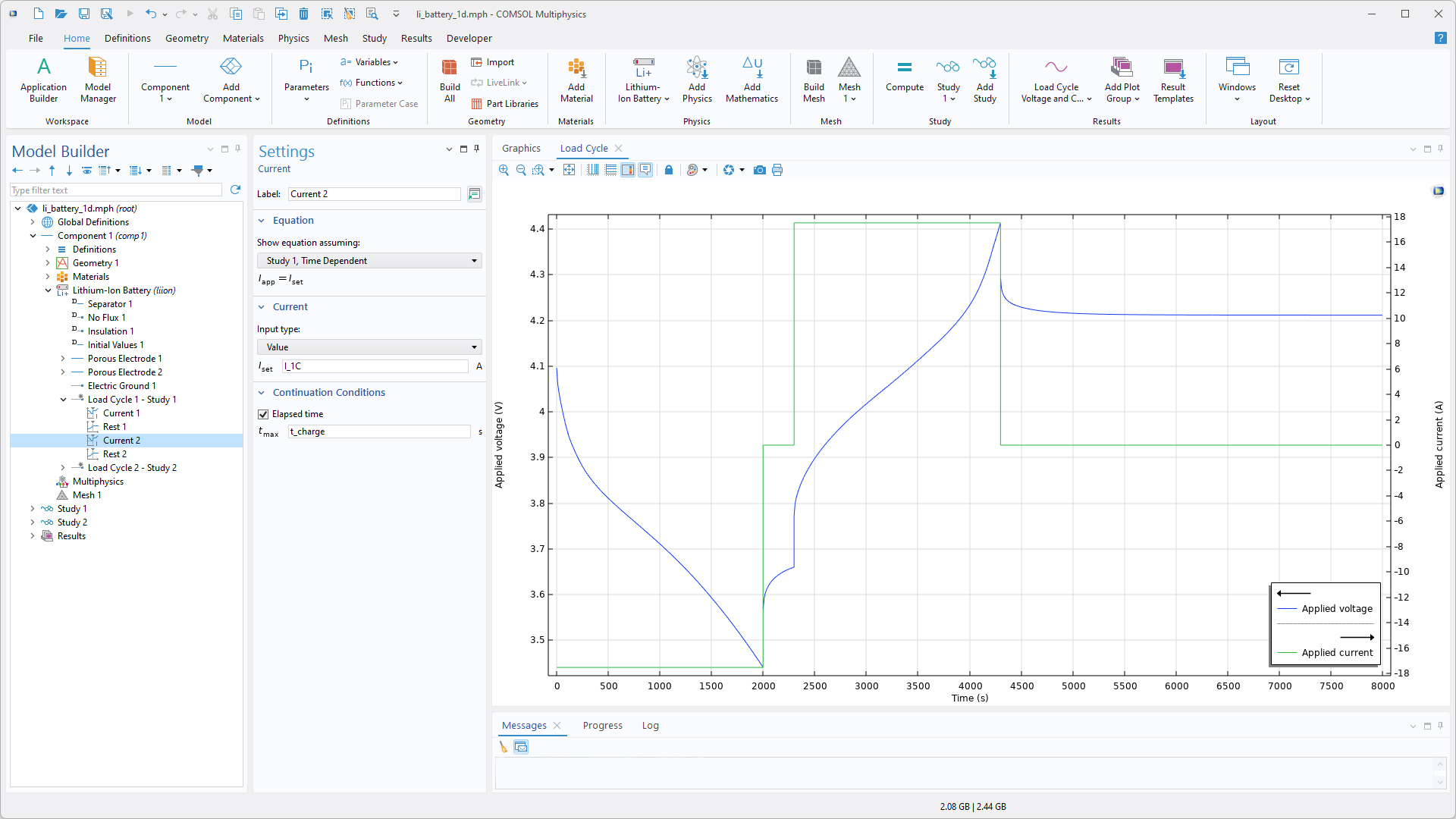 Il est désormais possible d'évaluer l'ampleur des pertes de puissance totales dans une cellule de batterie et de comparer les pertes entre les différents composants, tels que le séparateur, l'électrode et le conducteur de courant, à l'aide des nouvelles variables de perte de puissance introduites dans les interfaces Électrochimie. Ces variables peuvent également être utilisées pour calculer le rendement énergétique aller-retour d'une cellule de batterie sous un cycle de charge-décharge en intégrant les pertes de puissance dans le temps.
