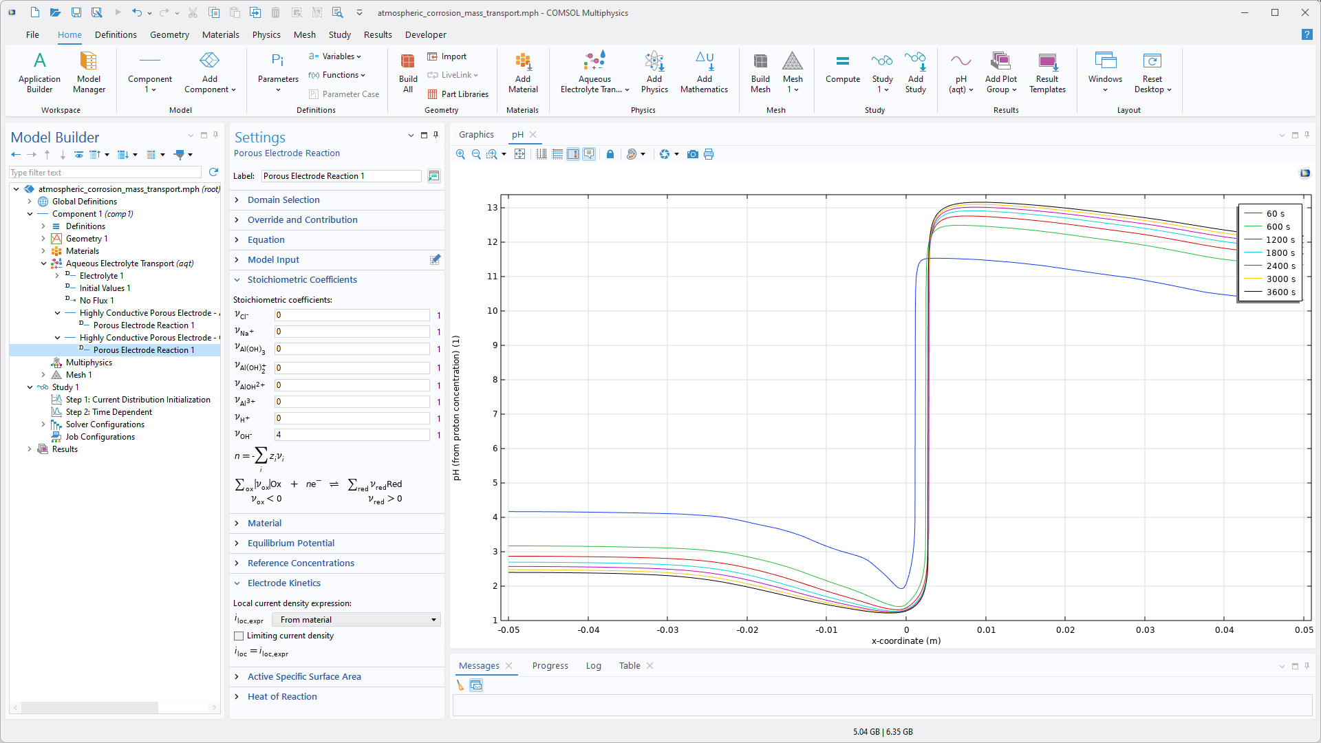 Pour la modélisation d'électrolytes aqueux contenant des acides faibles, des bases faibles, des ampholytes et des espèces complexes génériques, ainsi que pour des applications telles que la modélisation du mécanisme de la corrosion, les modèles électrochimiques de systèmes biologiques et la modélisation de capteurs électrochimiques, une nouvelle interface Transport d'électrolyte aqueux calcule les champs de potentiel et de concentration d'espèces dans un électrolyte aqueux dilué. Le transport est défini par les équations de Nernst-Planck, qui intègrent la diffusion, la migration et la convection, ainsi que l'électroneutralité et la réaction d'équilibre d'auto-ionisation de l'eau (autoprotolyse). En raison de son traitement plus efficace des équations de réactions et de sa configuration plus simple, la nouvelle interface peut être préférable dans certains cas à l'interface plus générique Distribution de courant tertiaire, Nernst-Planck.