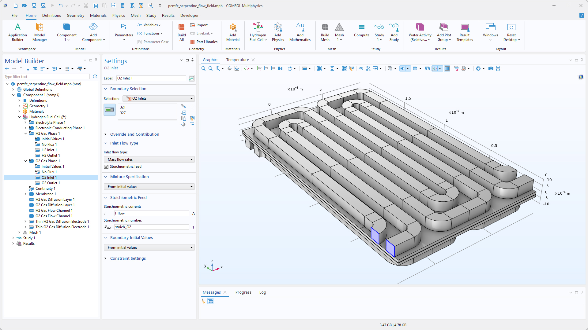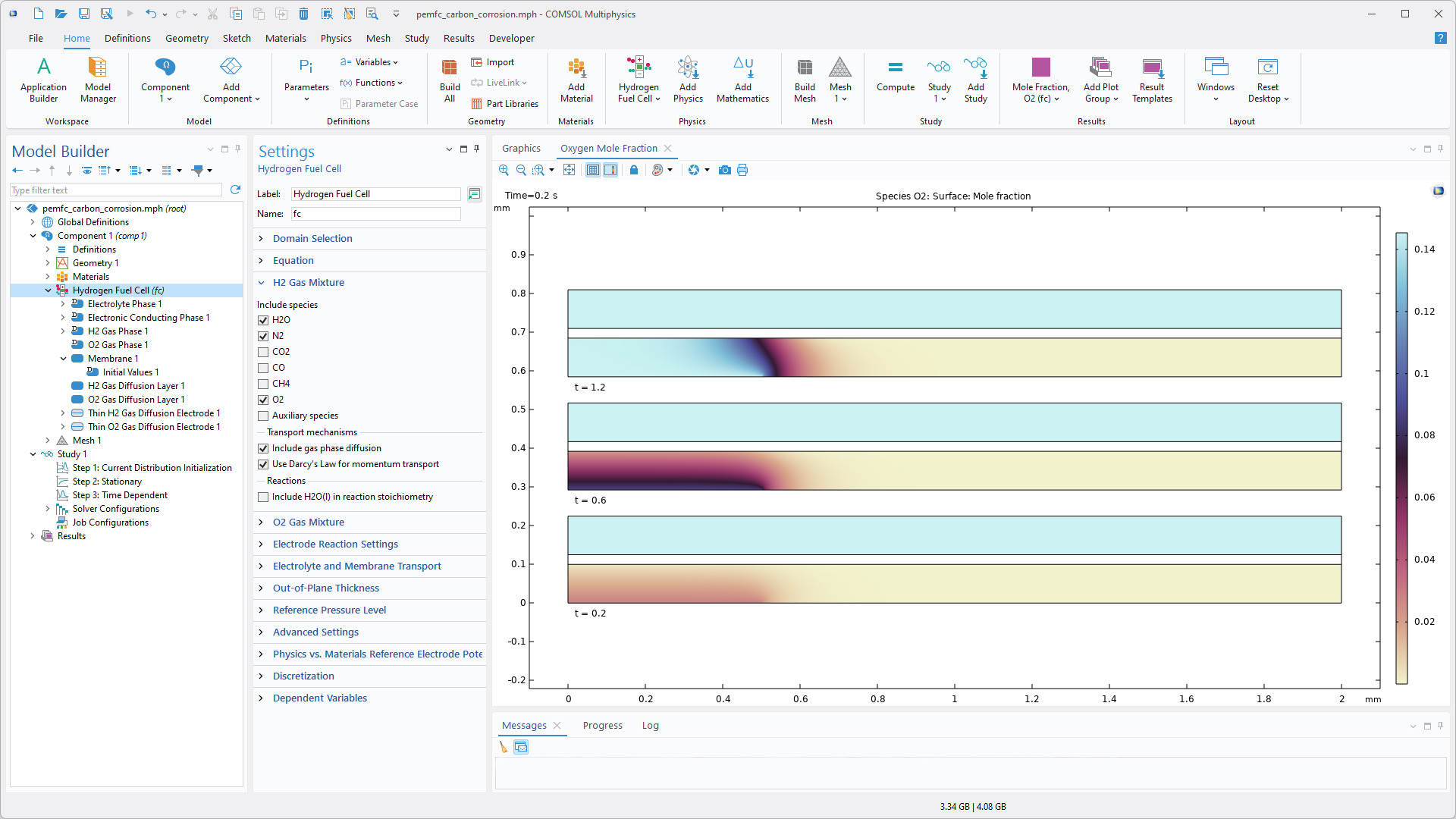 Afin d'analyser des modèles plus avancés de vieillissement, de réactions parasites et de scénarios de démarrage-arrêt, les interfaces Pile à combustible à hydrogène et Electrolyse de l'eau permettent désormais de sélectionner H2 en tant qu'espèce gazeuse active dans les réglages Mélange de O2 gazeux et O2 en tant qu'espèces gazeuse active dans les réglages Mélange de H2 gazeux. Cette nouveauté peut être visualisée dans le tutoriel Carbon Corrosion in a Polymer Electrolyte Membrane Fuel Cell.