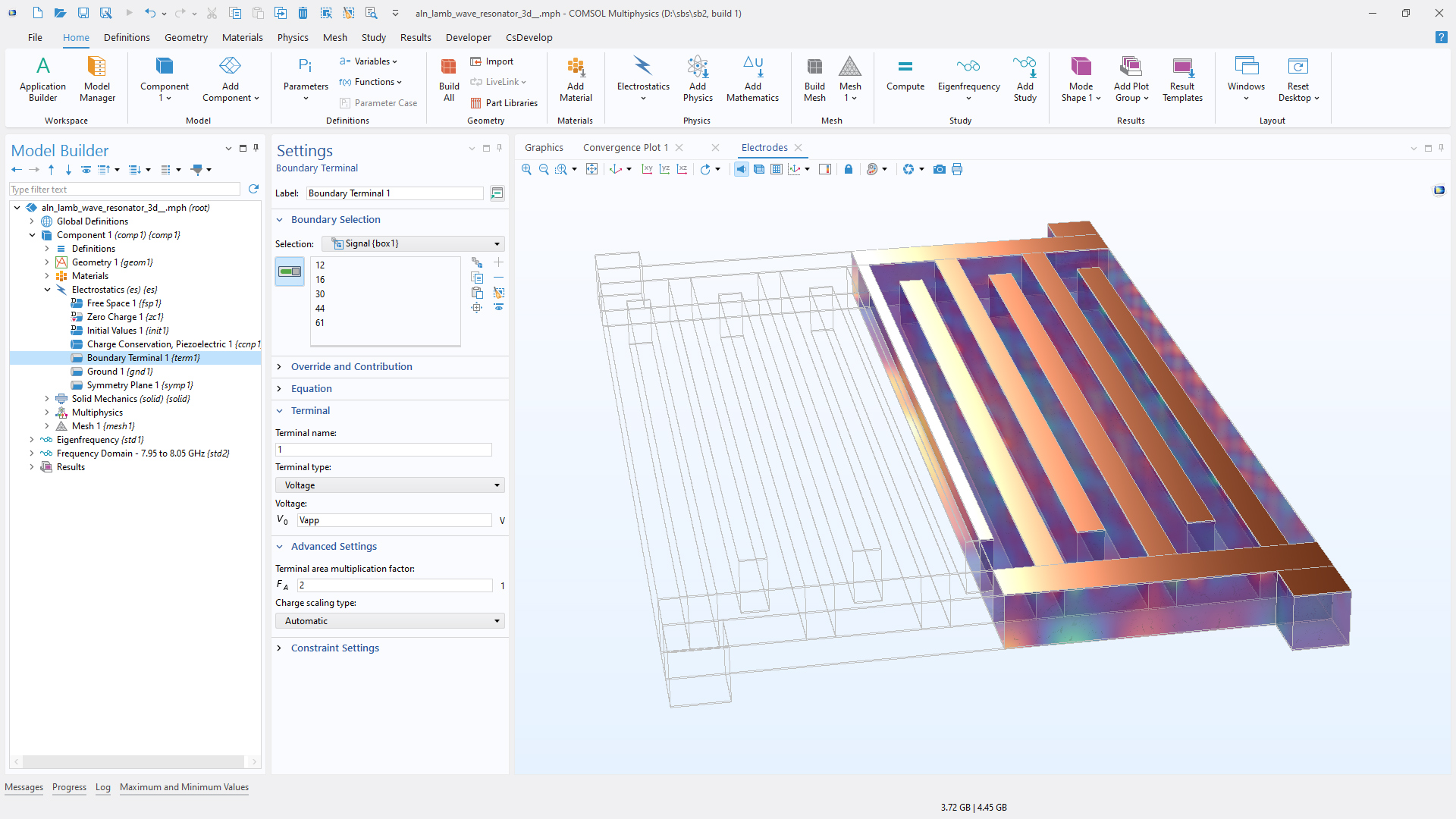 La fonctionnalité Terminal prend désormais en charge un facteur de multiplication de surface (disponible dans la section Paramètres avancés après avoir activé les Options avancées des physiques). Cela permet de tenir compte de la symétrie en redimensionnant la surface du terminal afin que les circuits ou les chargements connectés perçoivent l'intégralité du dispositif, même si seule une partie est modélisée. Par exemple, un facteur 2 doit être utilisé si le modèle représente la moitié du dispositif. Cette nouveauté est disponible pour les interfaces Electrostatique, Courants électriques et Champs magnétiques et électriques.