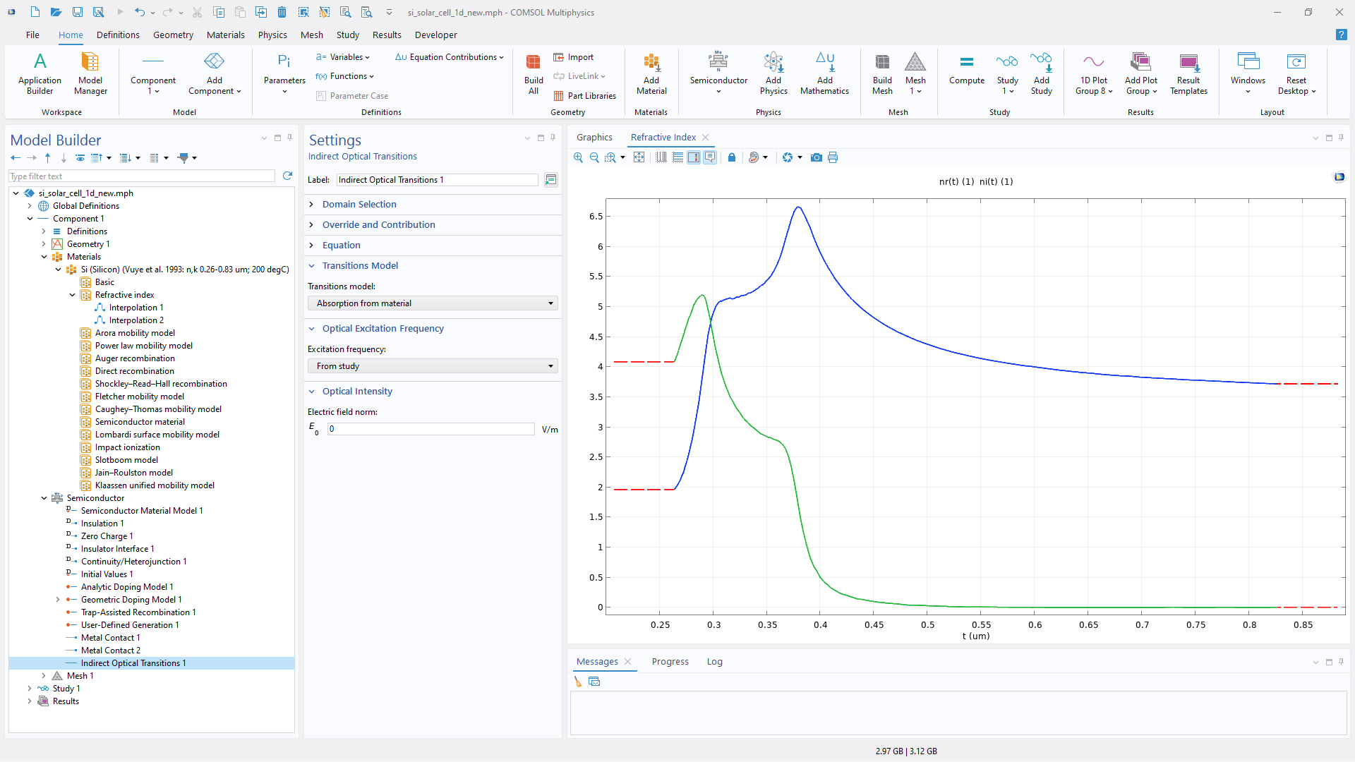 Pour permettre la définition de transitions optiques directement à partir de matériaux optiques, la fonctionnalité Transitions optiques indirectes introduit un nouveau modèle dans lequel l'indice de réfraction du matériau est utilisé pour calculer le taux de génération d'absorption indirecte.