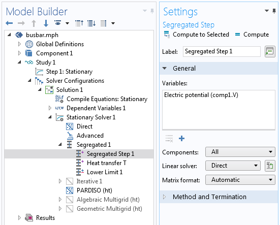 To set up the Segregated approach, right-click on the Stationary Solver or the Time-Dependent Solver feature and select Segregated to add a new Segregated feature. Then, right-click on the Segregated feature and add at least two Segregated Steps and select the variables that correspond to the physics that you want to solve within that step.