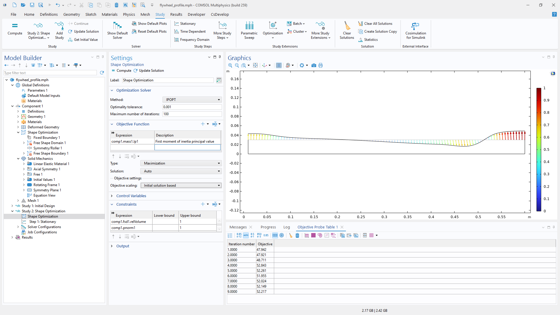 The flywheel profile optimization model illustrates the use of scaled objectives and constraints.