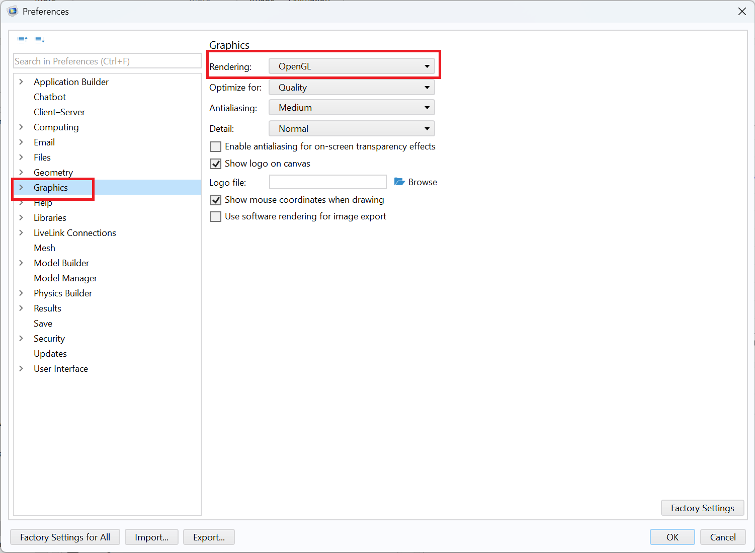 If you experience problems running COMSOL Multiphysics with OpenGL rendering, it can be worth changing the Optimize for setting in the Graphics part of the Preferences dialog (see image of the preferences dialog above). Changing that setting from Quality to Performance can make a difference.